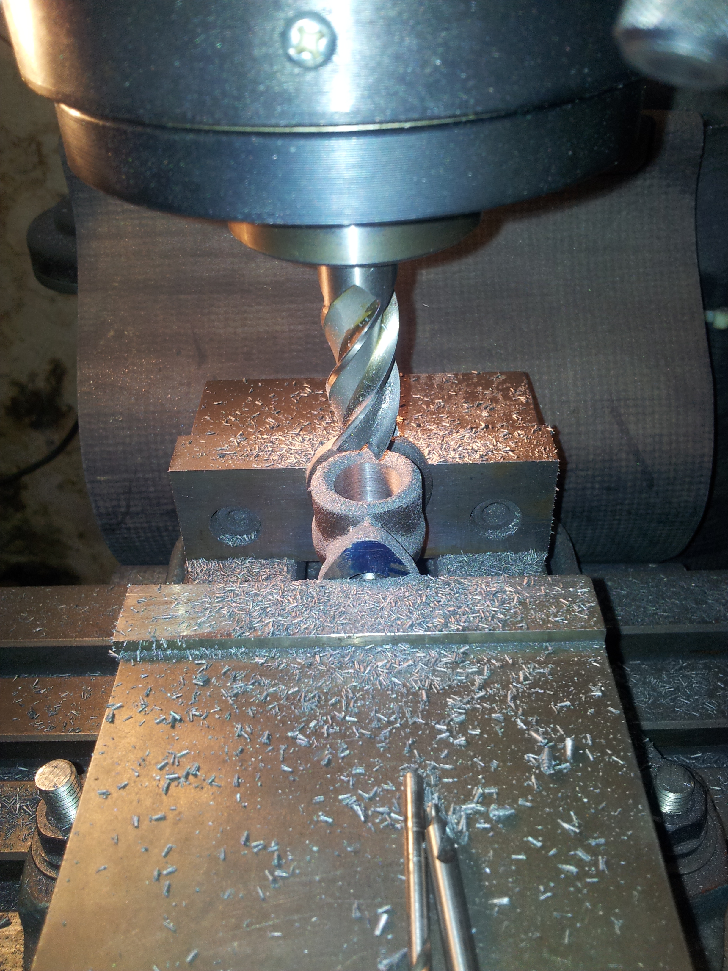 When you drill the intake hole on the flange face, pay attention! The inside is step. If you try to use a 1/4 drill, it will walk once it hits the inside step, been there. First find the hole, then center drill it. Use a small drill like 1/8 to drill a pilot through. Next use a 1/4 end mill to cut the rest. Even if you use a 2 flute end mill, you should pilot it so you don't get any walk. You can go all the way into the chamber with the mill since you want as much hole as you can get.